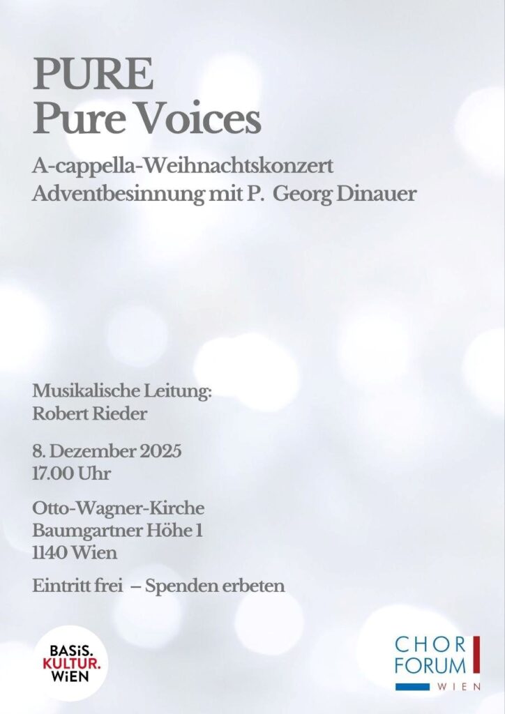 Am Montag, den 8. Dezember 2025, laden wir Sie herzlich zu einer musikalischen Adventstunde mit A-cappella-Liedern und besinnlichen Texten in die wunderbare Otto-Wagner-Kirche ein.